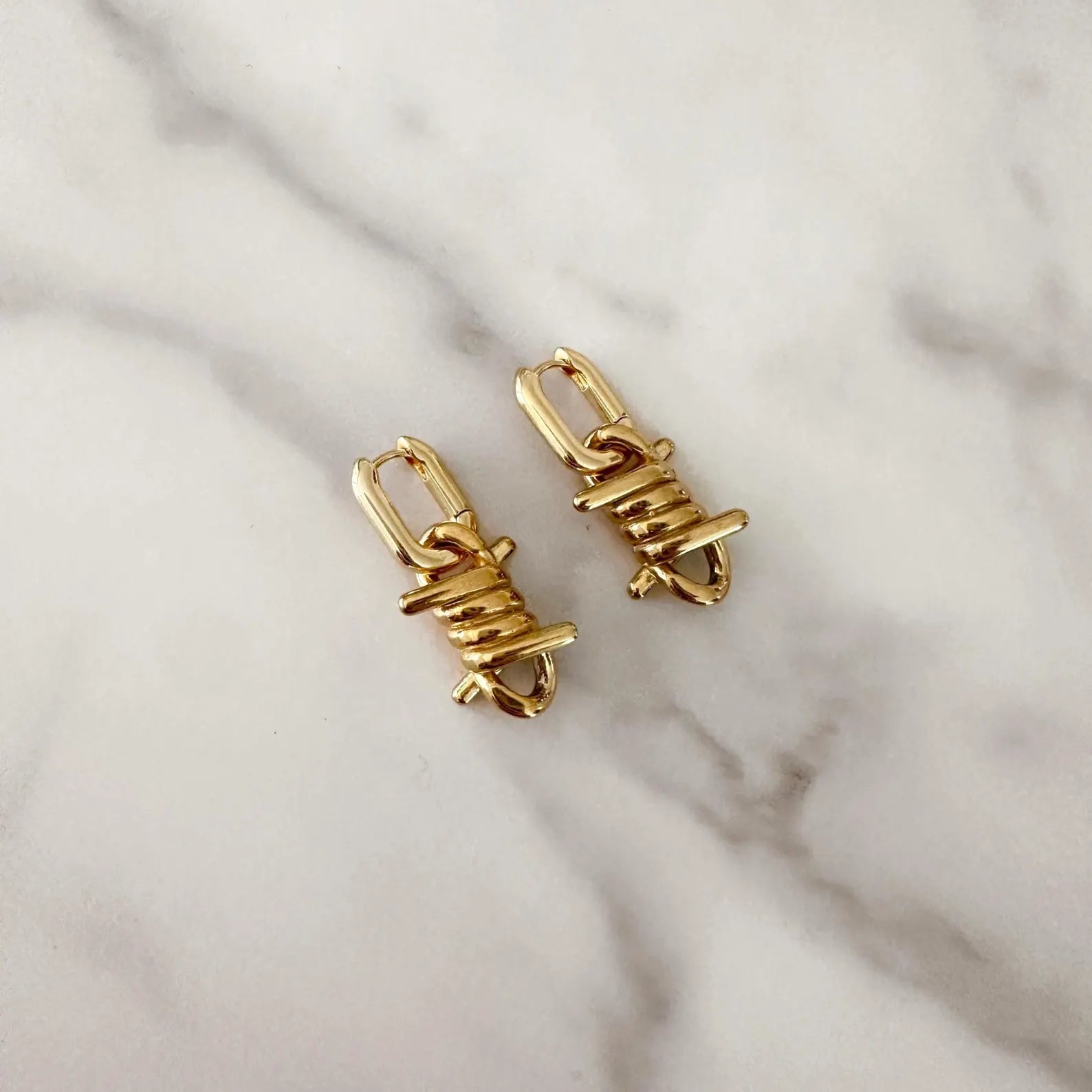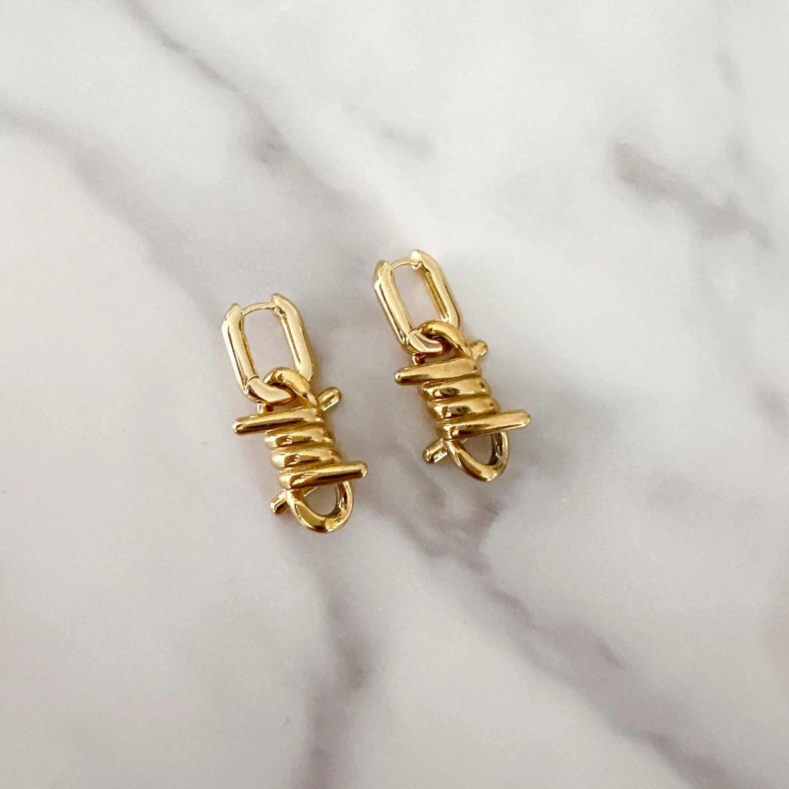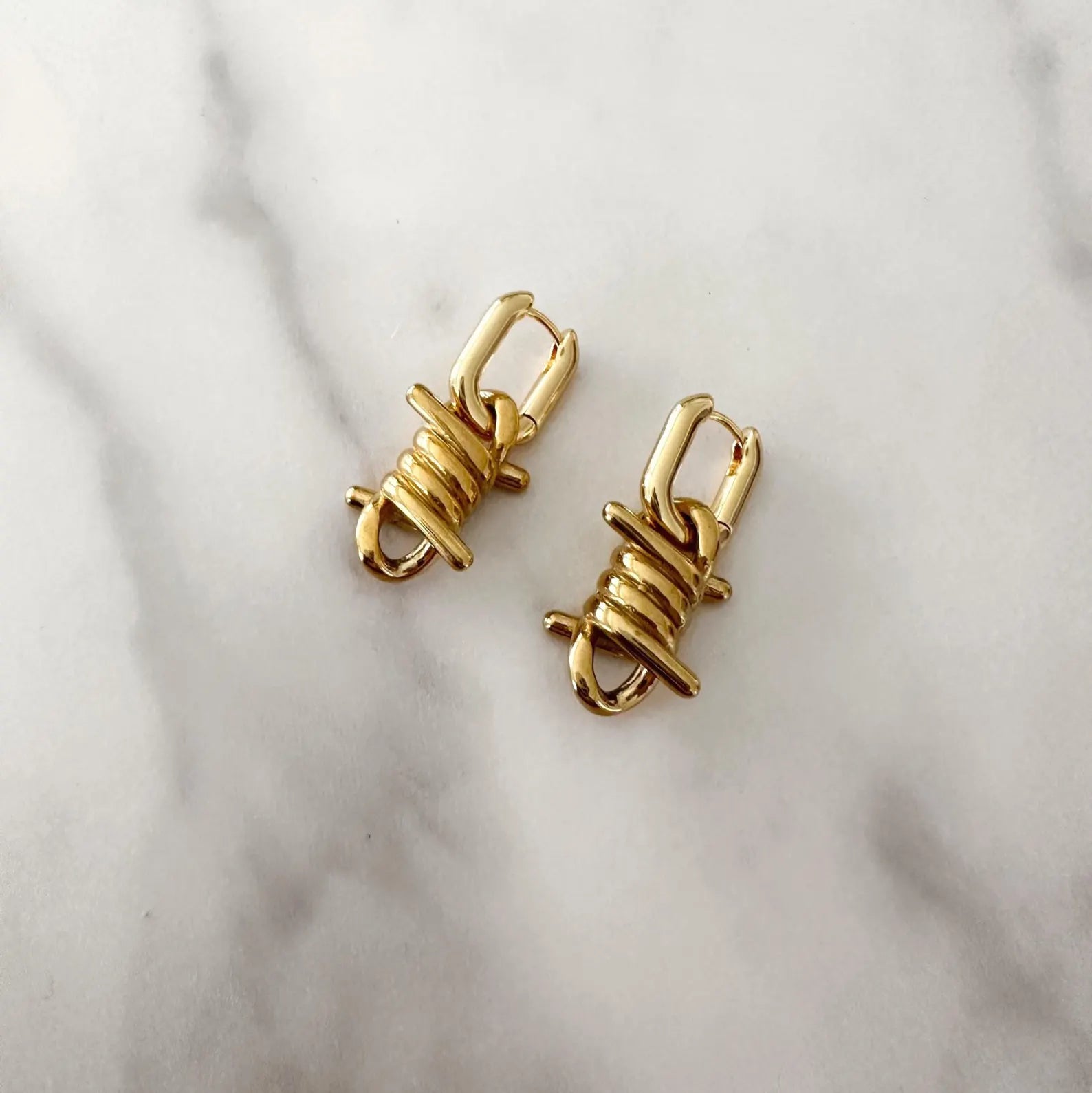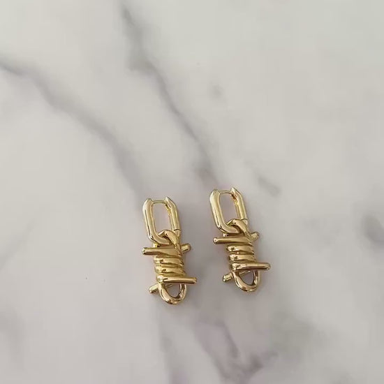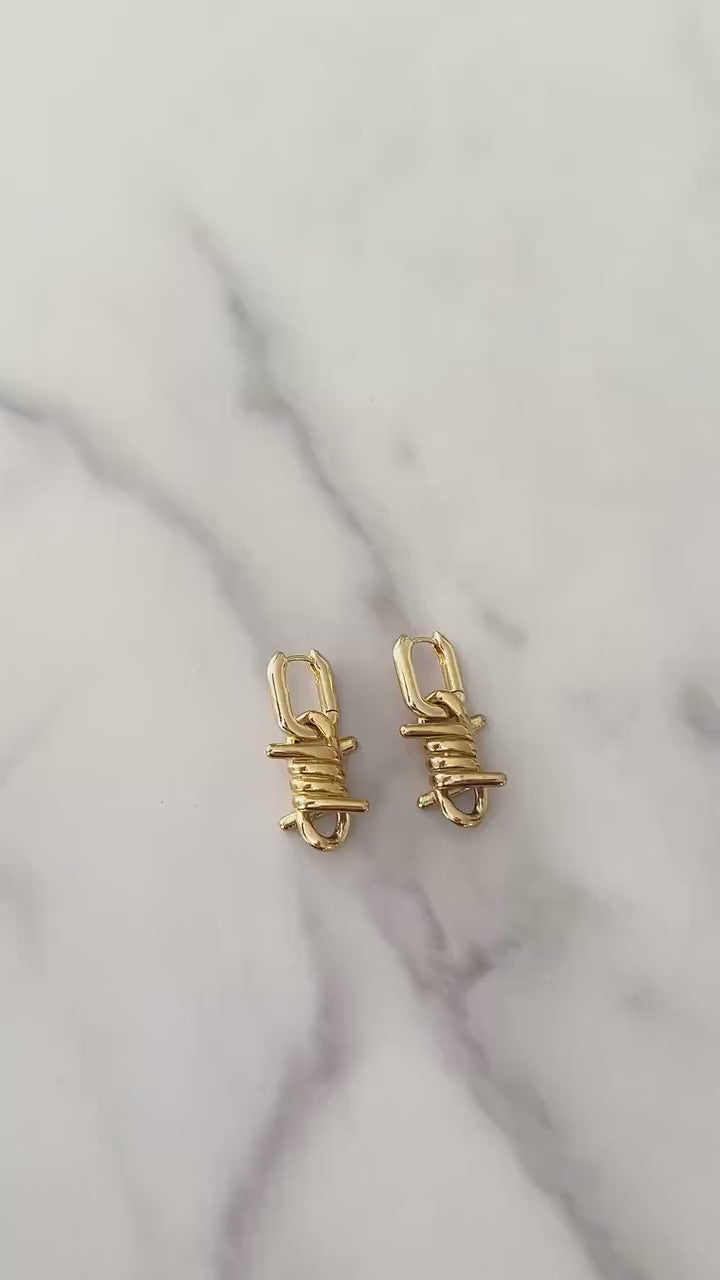 Elevate your jewelry collection with these refined 18k gold platted barbed wire earrings, where contemporary design meets timeless elegance. Each piece features meticulously crafted gold plating that captures light beautifully, creating a sophisticated statement without sacrificing subtlety. The barbed wire motif brings an unexpected artistic dimension to your ensemble, appealing to those with discerning taste and an appreciation for avant-garde aesthetics. Versatile enough for both men and women, these unisex drop earrings transition seamlessly from evening wear to curated everyday styling. A testament to modern luxury that celebrates individuality through thoughtful, distinctive design.